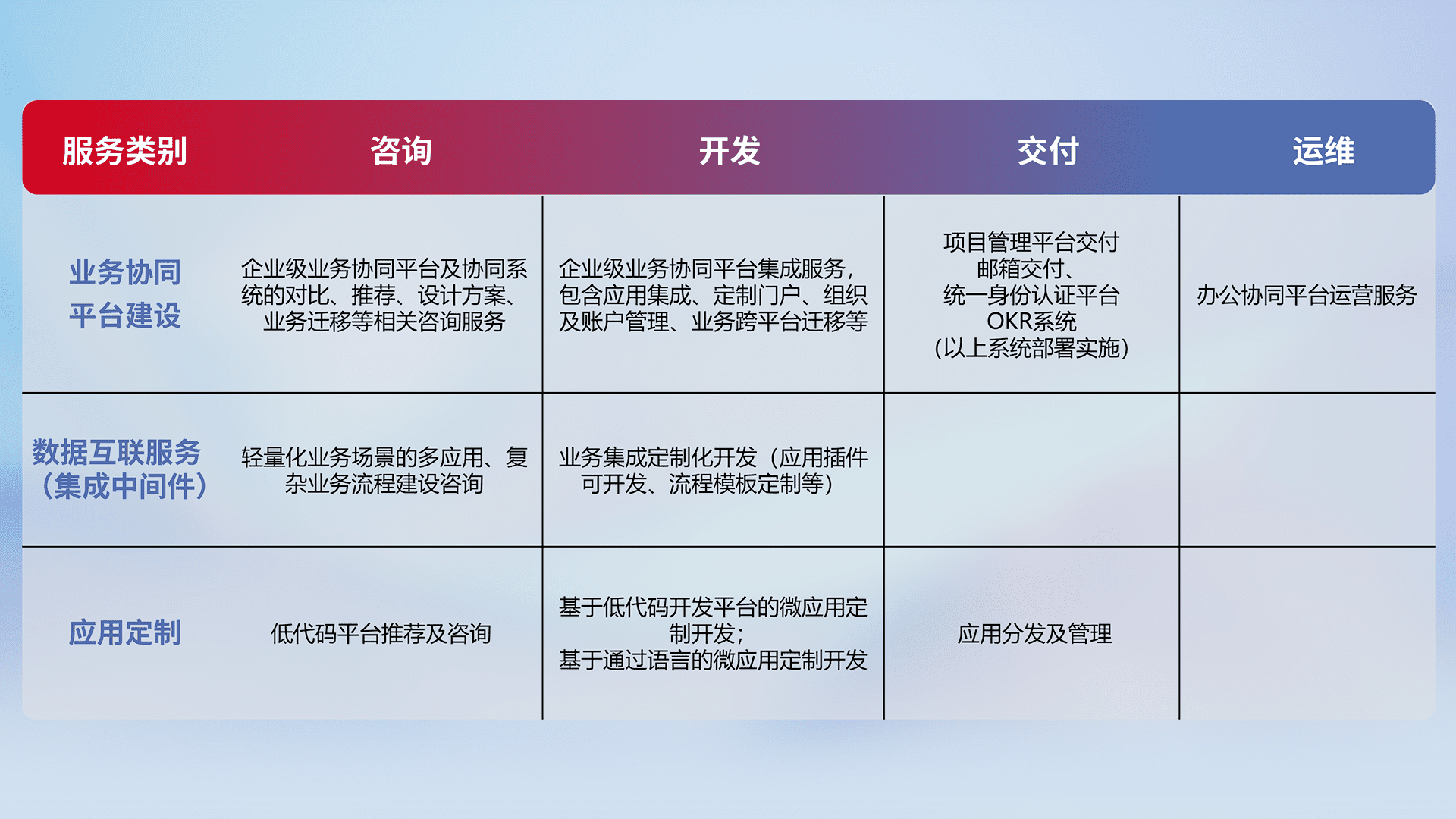 针对钉钉、、、企微、、、、IDaas等平台级产品提供产品的规划、、方案、、交付、、、定制化开发等服务,,实现如统一协同办公、、智能客户服务、、、、混合会议管理、、、智能数据查询、、、等业务场景,,,,实现数字化转型。。。